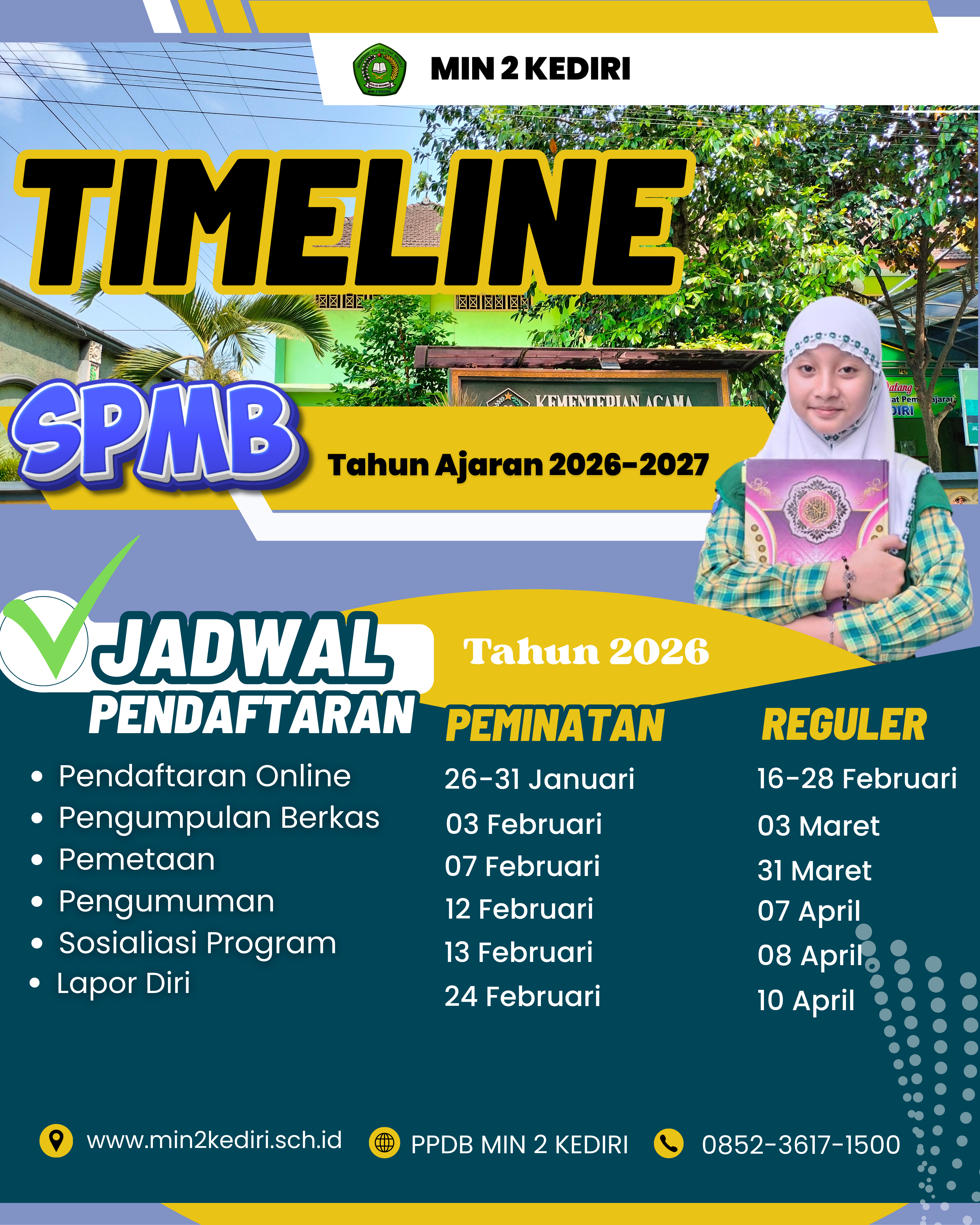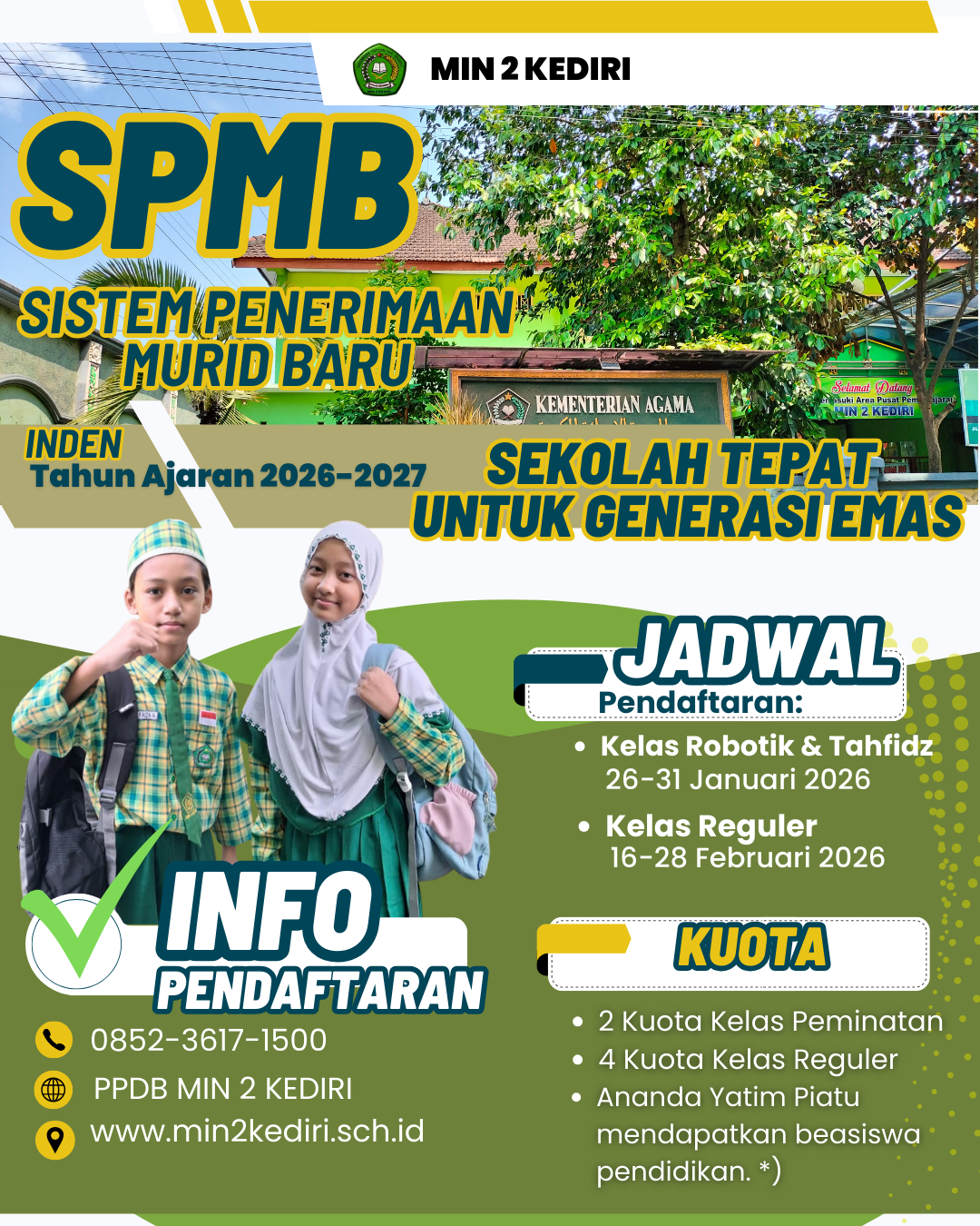 PMB SISTEM PENERIMAAN MURID BARU SISTEM PENERIMAAN MURID BARU(SPMB) MIN 2 KEDIRI TAHUN AJARAN 2026/2027 Madrasah Ibtidaiyah Negeri 2 Kediri melaksanakan S